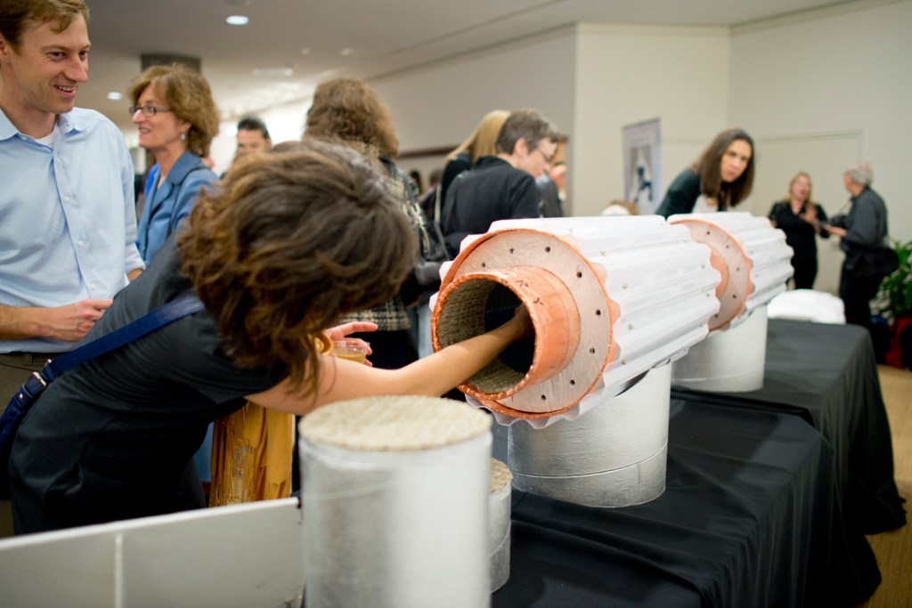 The nine designs were as unique as they were functional; challenging any preconceived ideas about the appearance of outdoor shelters for feral cats. While all designs attracted the curiosity of attendees, the model that drew the most attention was “Corrugated Aerospace Tower Station (C.A.T.S.)” by Cunningham Quill Architects. This ingenious design featured a long cylindrical tube with balls of catnip strung along the inside. However, such a unique and clever design might be best suited for “trimmer” cats: the openings on either end aren’t exactly designed for larger cats.